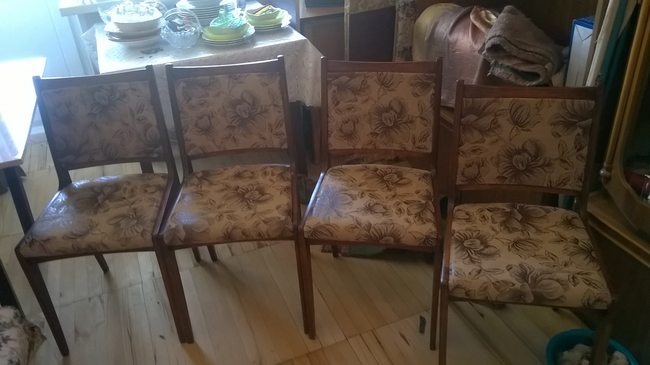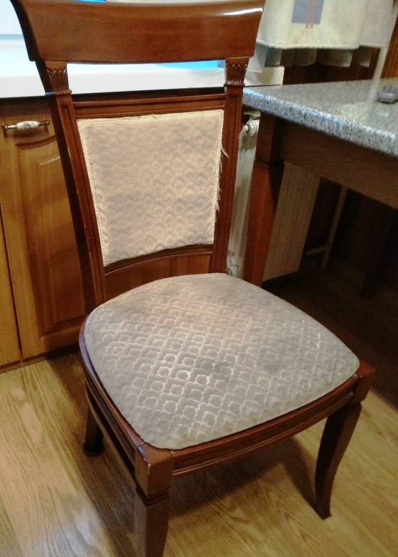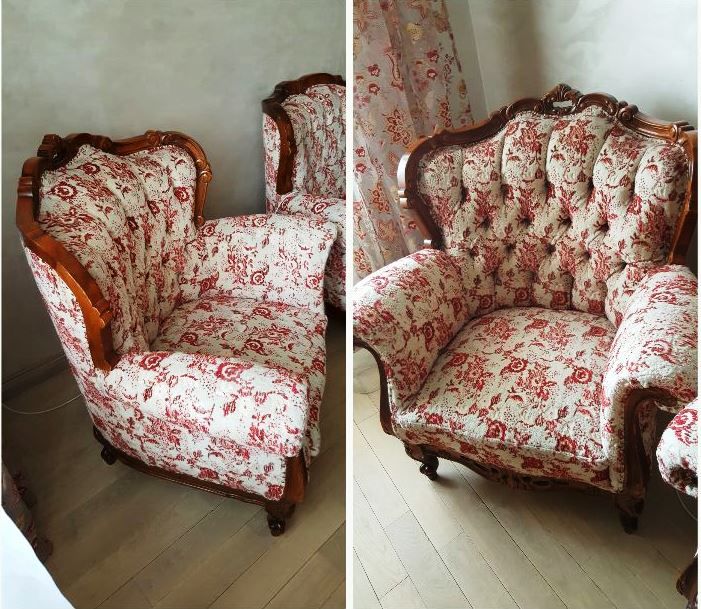 Описание работ: Перетянули жаккардовой тканью 8 стульев, сделали профилактику наполнителя, выполнили склейку и ремонт.