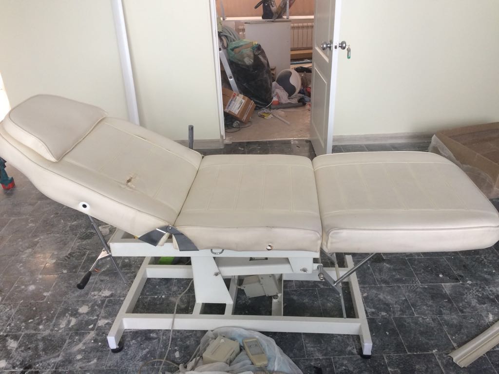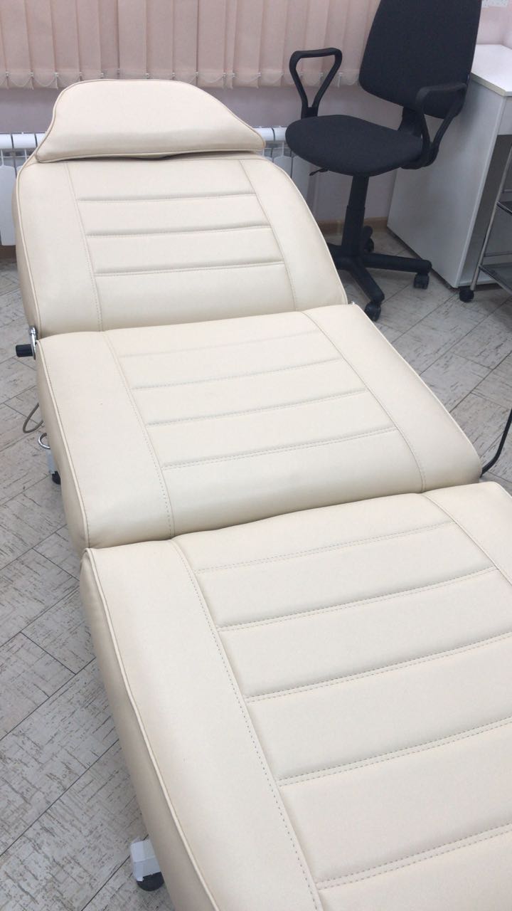 Описание работ: Заменили старую обивку косметологического кресла и сделали декоративную отстрочку. Материал — сертифицированный медицинский кожзам.