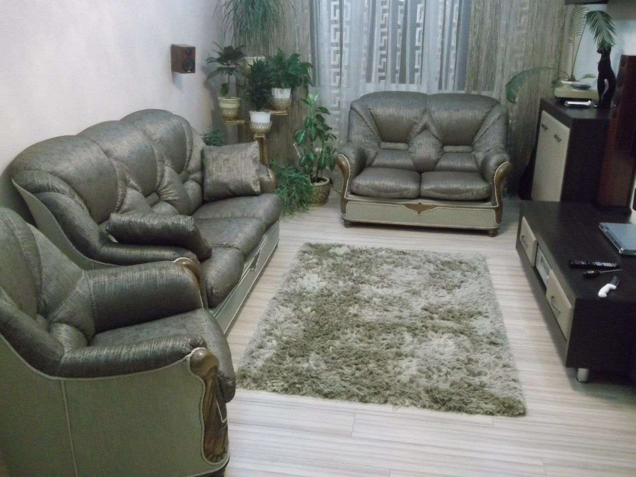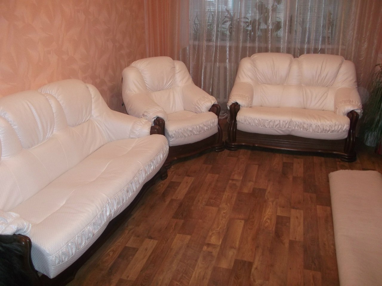 Описание работ: Выполнили полную реставрацию дивана и 2-х кресел. В работе использовали изящную ткань микровелюр "Чайная Роза". По просьбе заказчика отполировали и покрыли лаком каркас.